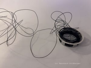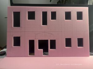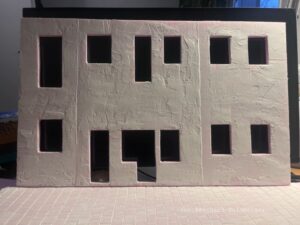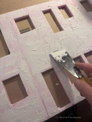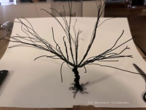 Baum im Vordergrund: Der Baum vor der Fassade wird aus schwarzen Draht geflechtet und im Anschluss mit Heißluftpistole verklebt und mit feinen Sand bestreut. Im Anschluss wird Dekomoos auf die Drähte gegeben.