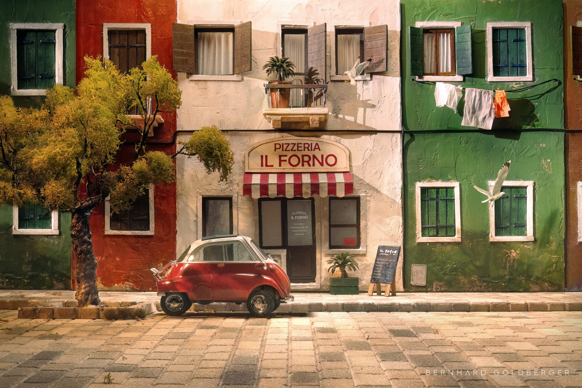 Ein roter BMW Isetta dient als Blickfang im Vordergrund. Um den „Spielzeug-Look“ zu verlieren, wurde das Modell dezent mit Staub patiniert. Besonderes Augenmerk liegt auf der Fotografie. Durch die Simulation von Tages- und Nachtlicht sowie das Spiel mit der Tiefenschärfe verschwimmen die Grenzen zwischen Modell und Realität. Kleinere Elemente wie die Möwen ergänze ich bewusst in der digitalen Nachbearbeitung, um die perfekte Bildstimmung zu erzeugen.