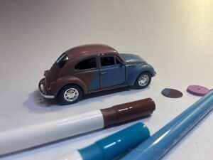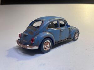 Die Basis für dieses Projekt ist ein preiswertes VW-Käfer-Modell aus dem Fachhandel. Da Modelle in dieser Preisklasse oft Mängel wie zu dicke Türrahmen oder eine zu kräftige Lackierung aufweisen, habe ich es händisch individualisiert: