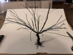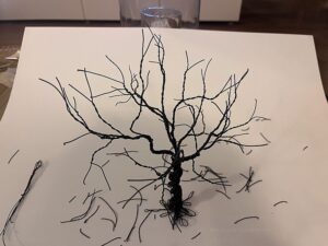 Die Bäume: Die kahlen Stämme habe ich aus schwarzem Draht geflochten und die Strukturen mit einer Heißklebepistole fixiert.