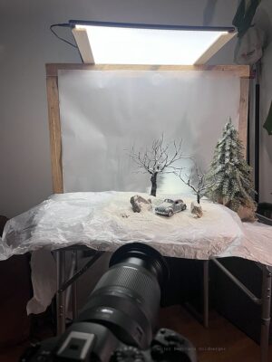 Der Schnee: Als Basis dient ein weißes Vlies. Für die feine Schneeschicht kam Mehl zum Einsatz. Erfahrungswert: Mehl ist für diesen Maßstab fast etwas zu grob. Für mein nächstes Projekt werde ich den Tipp von Kollegen beherzigen und Backpulver verwenden, da es noch feiner wirkt.