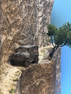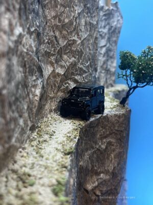 In der Scale Model Fotografie reizt mich besonders die Möglichkeit, Situationen zu erschaffen, die in der Realität kaum möglich oder der absolute Alptraum eines jeden Autofahrers wären. Dieses Bild zeigt eine solche Szene: Eine extrem enge Bergstraße ohne jede Sicherung, auf der ein Fahrzeug gerade noch Platz findet.