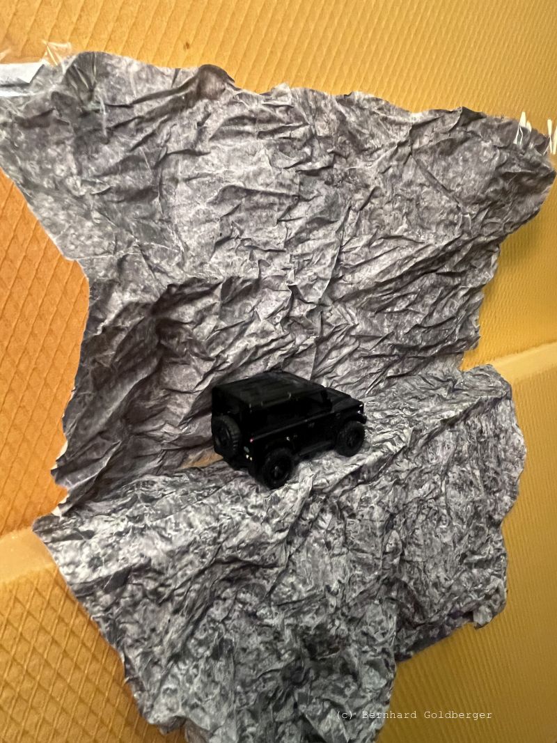 Auto: Ist eine Miniaturausgabe eines Geländeautos aus dem Handel, das ich mit geriebener Kreide anstaube.