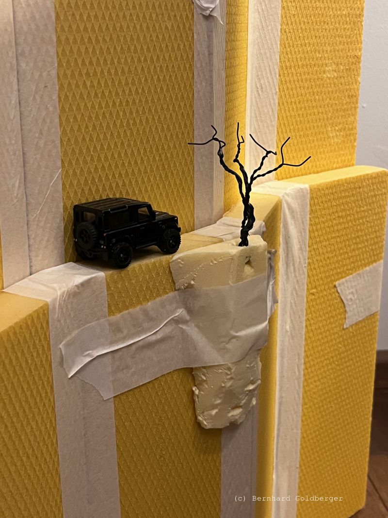 Die Basis für diese massive Felsformation bilden einfache Hartschaumplatten. Um die realistische Oberflächenstruktur zu erzielen, greife ich zu einem besonderen Trick:
