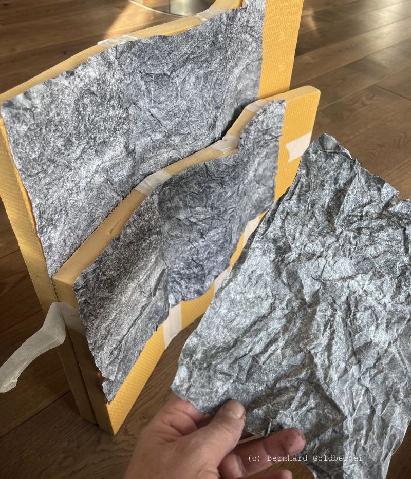 Verarbeitung: Die ausgedruckten Bögen werden ordentlich zerknittert, bis sie die raue Haptik von echtem Stein imitieren.