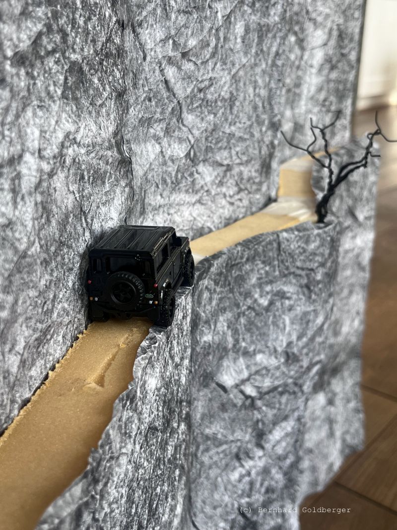 In der Scale Model Fotografie reizt mich besonders die Möglichkeit, Situationen zu erschaffen, die in der Realität kaum möglich oder der absolute Alptraum eines jeden Autofahrers wären. Dieses Bild zeigt eine solche Szene: Eine extrem enge Bergstraße ohne jede Sicherung, auf der ein Fahrzeug gerade noch Platz findet.