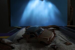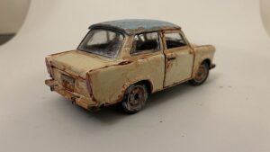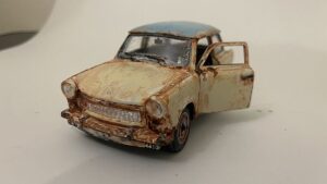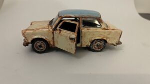 Vorbereitung: Basis der Szenerie ist ein alter Lada, den ich in ein maritimes Wrack verwandelt habe. Um den Effekt zu erzielen, als läge das Fahrzeug bereits seit Jahren unter Wasser, nutze ich eine spezielle Technik: