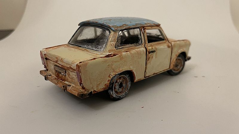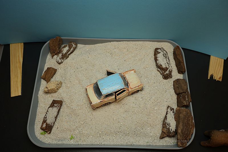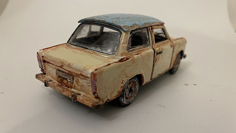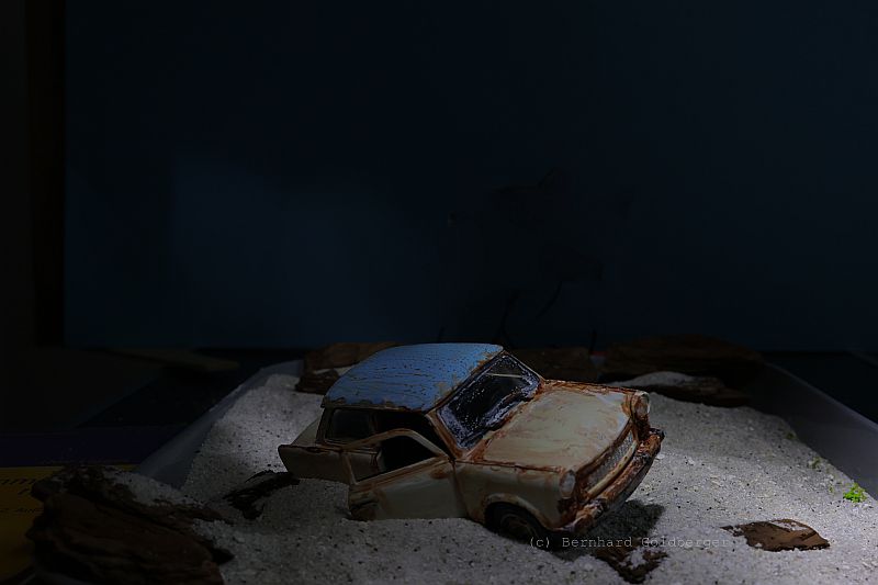 Vorbereitung: Basis der Szenerie ist ein alter Lada, den ich in ein maritimes Wrack verwandelt habe. Um den Effekt zu erzielen, als läge das Fahrzeug bereits seit Jahren unter Wasser, nutze ich eine spezielle Technik: